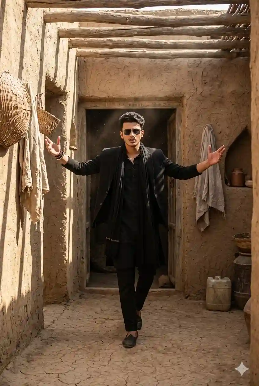 A hyper-realistic cinematic shot of a man stepping out of a narrow traditional mud-brick doorway in a rustic village setting. He wears a full black outfit - black kurta, black blazer, and a long black scarf - along with dark sunglasses. His arms are extended outward in a powerful, confident motion, with a bold expression on his face, capturing a dramatic hero-like entrance.