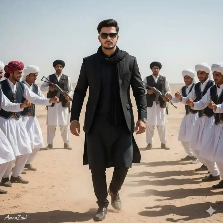 Full-body portrait of an 18-year-old young handsome man with a skinny body, lightly dancing in the center while walking forward in a bright daytime desert setting (Rath ki midan). He is wearing a pure black traditional kurta, a waist-length formal black coat (not long), and a thick plain black muffler resting naturally around the neck with no wrapping or twisting. Replace the face with MY FACE with 100% accuracy, matching lighting, shadows, angle, and realistic skin details. Add stylish black sunglasses. On both sides of him, very close, a lively Balochi group dressed in traditional white clothing with unique Balochi pagdhi (head turbans) is dancing joyfully. They should be dancing along with the main subject, matching his light dance steps, creating a culturally vibrant and energetic scene. Far behind (dūr), two Afghani men stand as bodyguards, each holding an AK47 in a controlled, non-aggressive stance. They should appear protective but not overpower the scene, keeping distance.