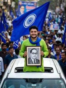 Ultra-realistic 8K DSLR photo of a young Indian man standing through the sunroof of a white car, wearing a bright green kurta and a blue scarf. He is holding a framed black-and-white portrait of Dr. B.R. Ambedkar with both hands properly, looking directly at the camera with a confident expression. Behind him, a large blue flag with the Ashoka Chakra is waving in the wind. Background shows a crowd with blue-themed decorations, slightly blurred.