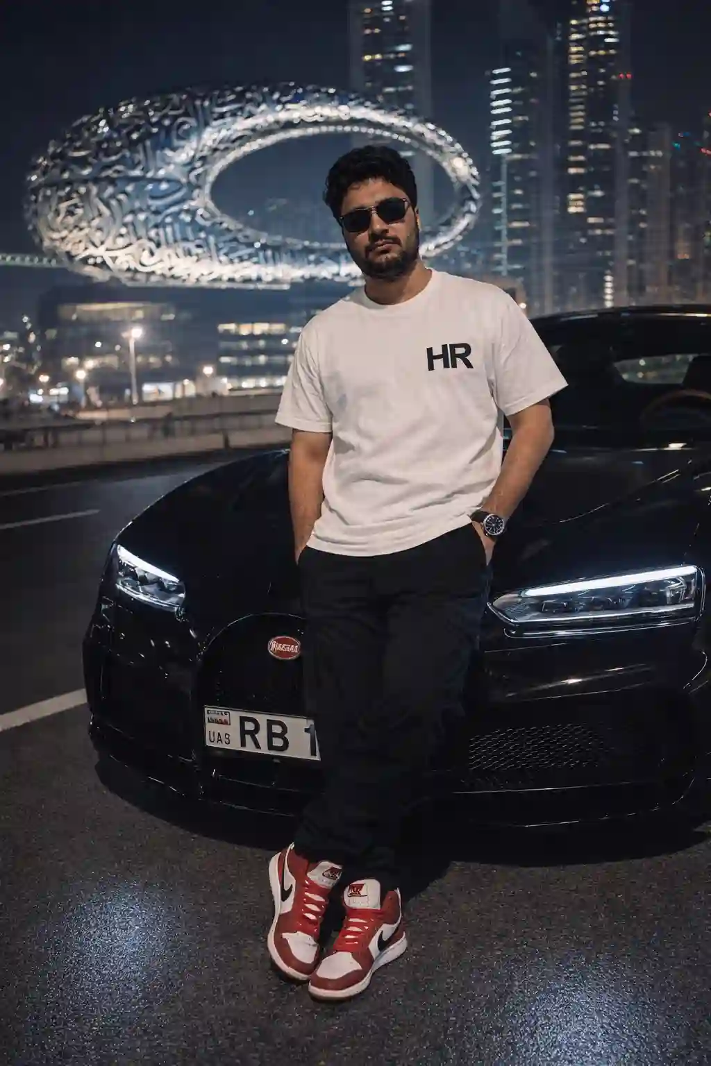 A stylish confident man exactly matching the uploaded reference image sits casually on the front hood of a white Porsche 911 GT3 RS inside a massive modern aircraft hangar, centered perfectly in the frame and facing the camera with a relaxed but dominant posture, legs slightly apart and hands resting naturally between his knees, neutral confident expression, hair falling naturally toward the forehead and slightly toward the camera. He is wearing a rich velvet green half polo shirt, very wide-leg light blue velvet jeans with a baggy heavy drape fit, black suede UGG-style boots, a sleek VVS diamond chain around his neck, visible hand jewelry and rings. The car is a white Porsche 911 GT3 RS with black racing stripes running across the hood and roof, black carbon fiber hood vents, black rims with low-profile performance tires, large rear wing visible, side decal “GT3 RS”, and a custom front plate reading “HRIDAY”. The environment is a huge clean aircraft hangar with high metal truss ceilings, evenly spaced rectangular industrial LED lights, a polished white concrete floor with soft reflections, strong architectural symmetry and deep perspective with minimal background clutter. Lighting is soft diffused overhead industrial lighting with even exposure, no harsh shadows, subtle reflections on the car body, natural realistic skin tones, high dynamic range. Camera angle is slightly low waist-level perspective with a 35mm lens look and deep focus so both the subject and car are razor sharp. Professional commercial automotive photography style, crisp detail, ultra high resolution, hyper-realistic, cinematic clarity, luxury streetwear aesthetic, clean neutral color grading with a slightly cool temperature, strong contrast without crushed blacks, premium automotive editorial campaign look, full body visible including boots, car filling most of the frame, perfectly symmetrical composition, 8K photorealistic detail.