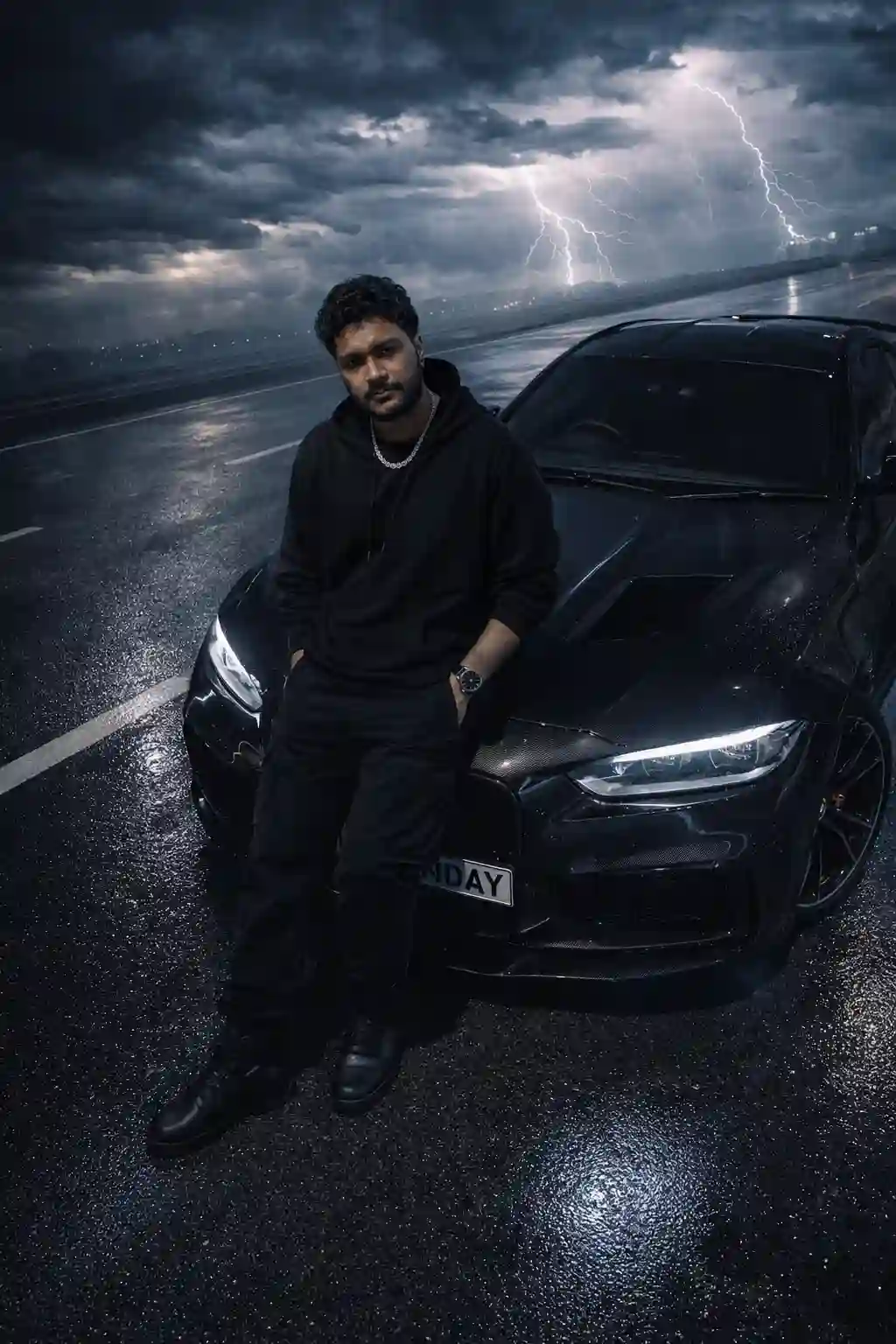 Ultra-realistic 4K hyper-detailed cinematic night street scene, a satin-black BMW supercar parked on a vast empty wet asphalt road under a dramatic stormy sky, distant lightning illuminating thick turbulent clouds on the horizon. A muscular masculine man dressed in all-black streetwear casually leans against the hood of the car — oversized black hoodie, slim black cargo pants, heavy combat boots, silver chain necklace. Calm yet powerful expression, defined cheekbones, masculine aura, slightly messy hair styled back. The BMW features a satin black finish, carbon fiber hood vents, dark alloy wheels, and subtle glowing blue underglow lights reflecting across the wet pavement. Dramatic rim lighting outlines both the car and the male silhouette, glossy reflections on the wet road, realistic rain droplets on the body panels, detailed tire textures. Subtle fog rolling across the street, cinematic atmosphere, high contrast lighting, deep shadows, moody masculine luxury aesthetic. Shot from a high overhead drone perspective emphasizing the lone car and figure within a wide empty landscape. Professional automotive editorial photography, car magazine cover style, ultra-sharp clarity, HDR lighting, photorealistic reflections, cinematic color grading, ultra-HD 4K resolution, extremely crisp details, hyper-realistic, no noise, no grain, no artifacts.