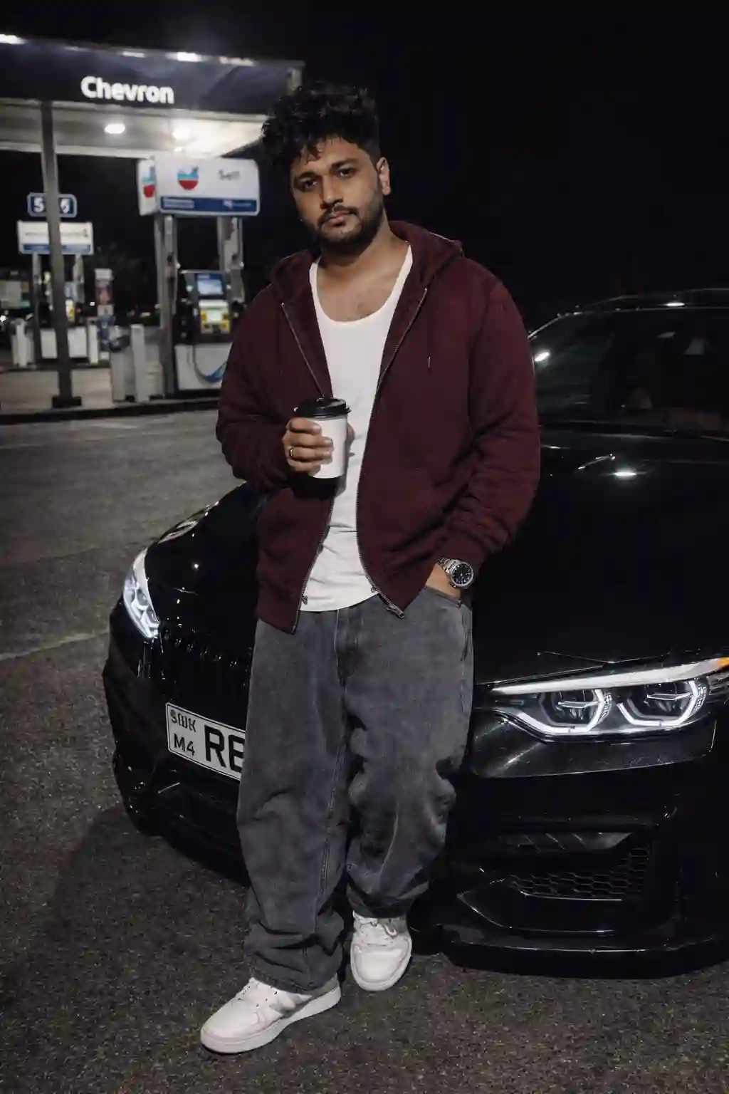 Create image A realistic  a young man with voluminous messy hairstyle and a sarph fade (matching reference)he wearing a mehroom zip hoodie with over a white ganji, and grey denim baggy jeans white shoes He is standing casually his one in his pocket and holding a coffee, near a glossy black luxury sports car (BMW M4) at a Chevron gas station at night. The scene features raw "direct camera flash" photography, creating sharp shadows and a gritty urban vibe. The background shows gas pumps with "Self" and "Chevron" signage under bright fluorescent station lights, with a dark, slightly grainy retro film aesthetic.