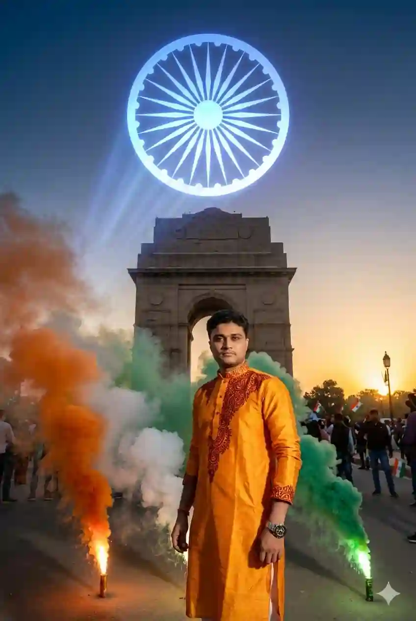 Create a Republic Day 2026 patriotic photo. Put me near India Gate with tricolor smoke effects in saffron, white, and green. Add Ashoka Chakra light effect in the sky, realistic shadows, professional photography style, 4K resolution.