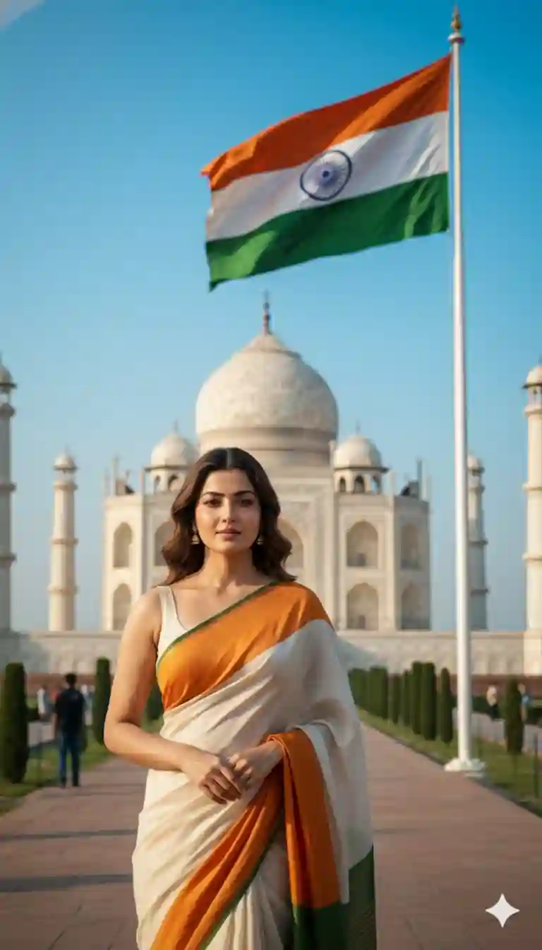 Google Gemini, create a photorealistic Republic Day 2026 image edit using my uploaded photo. Place an Indian woman wearing an elegant tricolor saree (saffron, white, and green) standing gracefully in front of the Taj Mahal, Agra.