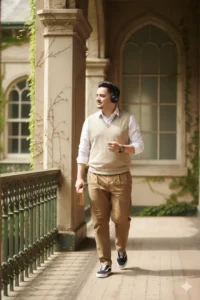 "A bright retro-aesthetic portrait of the same young man, with his exact facial features and physique, captured from a distance on a vintage college balcony, as if quietly observed. Soft daylight streams through tall, dusty windows, casting warm highlights and muted shadows that evoke a timeless, nostalgic atmosphere. He walks along the balcony, dressed in a crisp white Oxford shirt layered with a beige knit vest and pleated khaki loose-fit trousers, paired with black-and-white Vans shoes. A slim leather watch rests on his wrist, and a book is held in one hand as he walks forward, looking to the side as if lost in music. Black JBL headphones rest over his ears, seamlessly blending into the warm, retro environment."