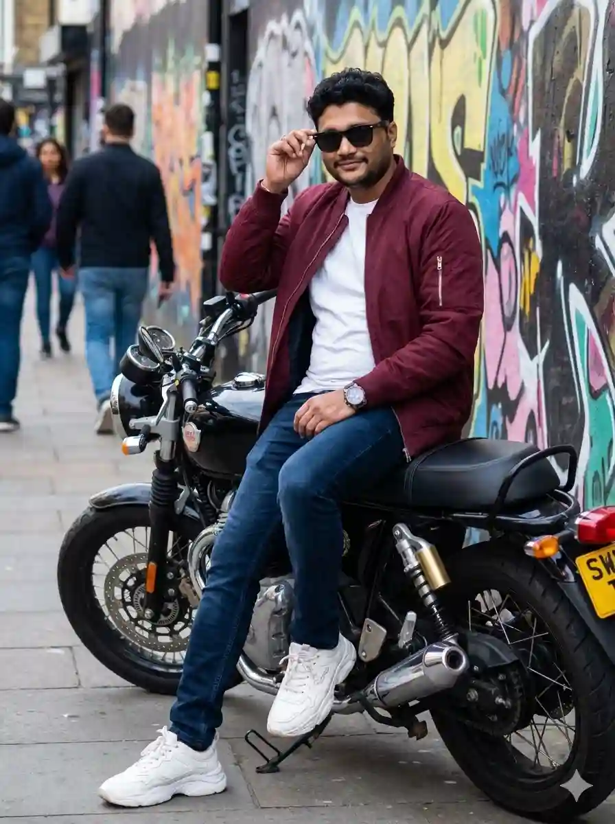 A high-resolution DSLR lifestyle shot of the same man (exact facial match) posing on his black retro motorcycle parked near a graffiti-covered urban wall. He wears a maroon bomber jacket over a white t-shirt, dark blue slim jeans, and chunky sneakers, accessorized with a watch and sunglasses. His pose is candid-seated on the motorcycle, one hand fixing his sunglasses, the other resting on the tank, with a subtle smile. The background is filled with colorful graffiti and blurred pedestrians, creating a vibrant, street-style cinematic vibe.