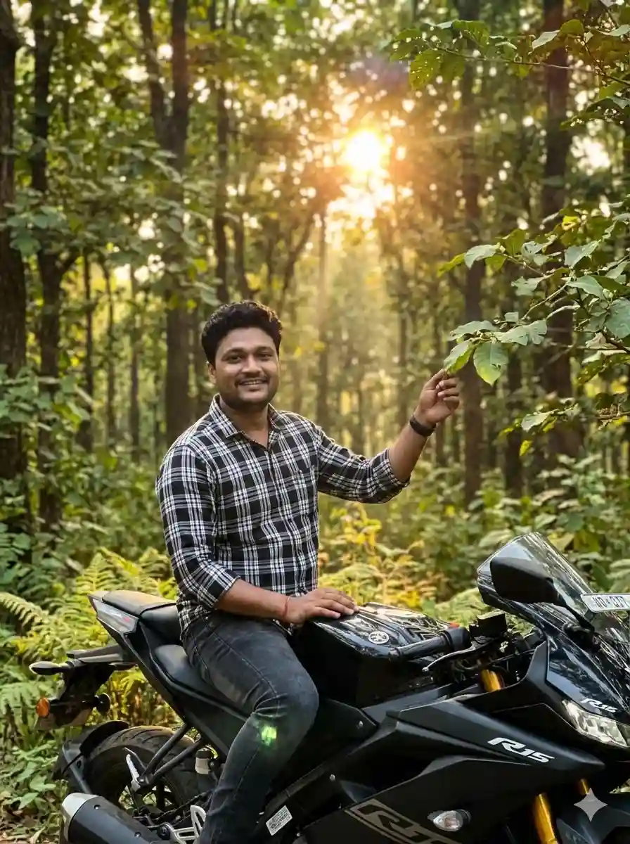 100% my face same to same and high quality regulations A stylish young man in image) is sitting on a Yamaha R15 bike in a lush, sun-drenched forest.