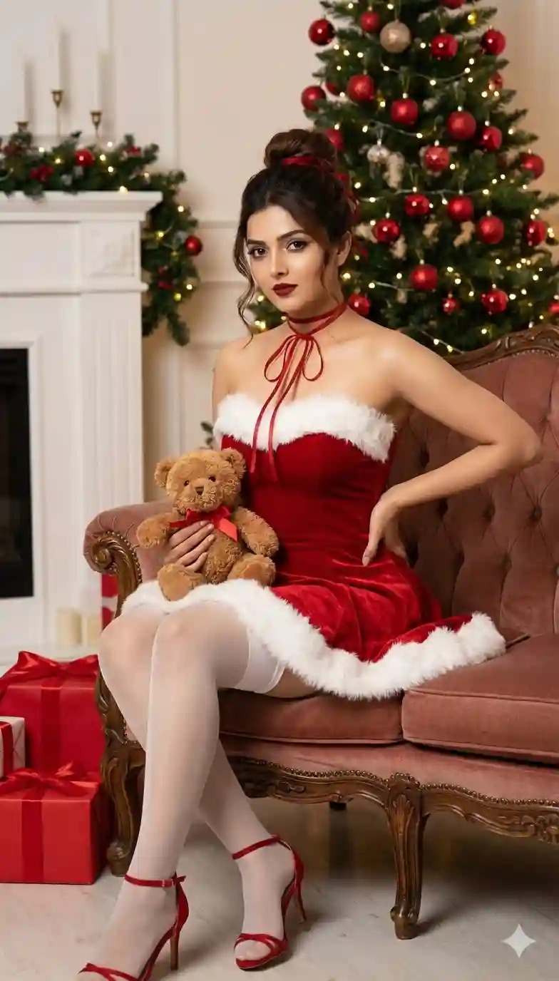 She's dressed in a Santa Claus-inspired outfit, seated on a classic sofa. The outfit: a strapless red velvet dress, trimmed with white fur at the top and bottom, with red ribbons around the neck. She wears white thigh-high stockings and red strappy heels. Hair and makeup: her dark hair is styled in a chic bun with red hair ties, and she wears dramatic eye makeup with defined lines and long lashes, and dark red lips. Gesture: She sits on the sofa, her left hand on her hip, holding a small brown teddy bear with a red ribbon in her right hand, and looks at the camera with a serene expression. Background: a lit Christmas tree decorated with red baubles in the background, along with a decorated white fireplace (partially visible on the left), and red gift boxes on the floor, creating a festive and warm atmosphere.
