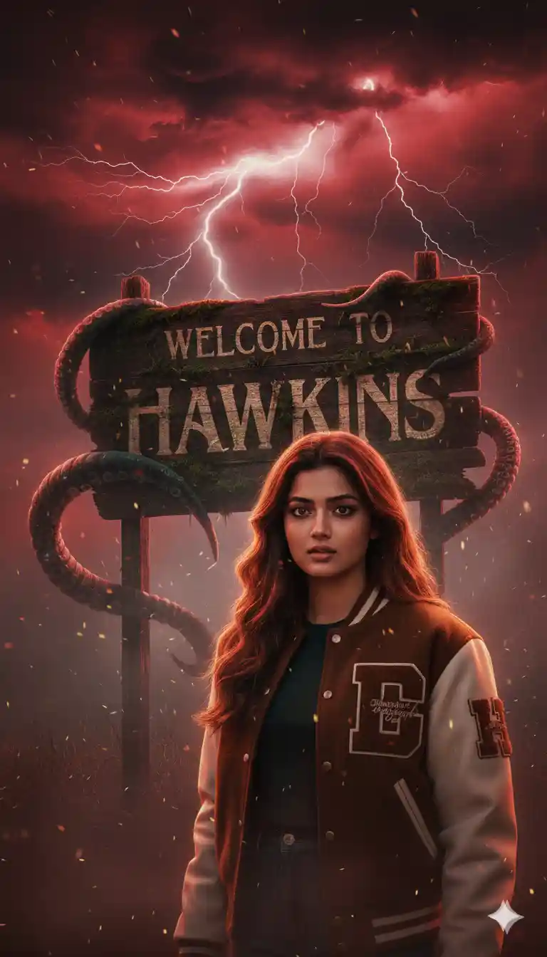 “Create a dramatic, ultra-realistic Stranger Things–style character portrait. Use the exact face from the reference image with 100% accurate facial preservation. The character wears a brown-and-white varsity jacket and stands in front of an old green ‘WELCOME TO HAWKINS’ sign. She turns her head toward the camera with a serious, suspicious expression. The sky behind her is dark red and stormy, filled with swirling clouds, lightning streaks, thick fog, and drifting particles. Large Demogorgon-like shadow tentacles coil around the Hawkins sign. Strong lightning-rim lighting highlights her hair and jacket. Use deep reds, blacks, and electric whites to create a cinematic, supernatural atmosphere with volumetric lighting and poster-style 8K quality.”