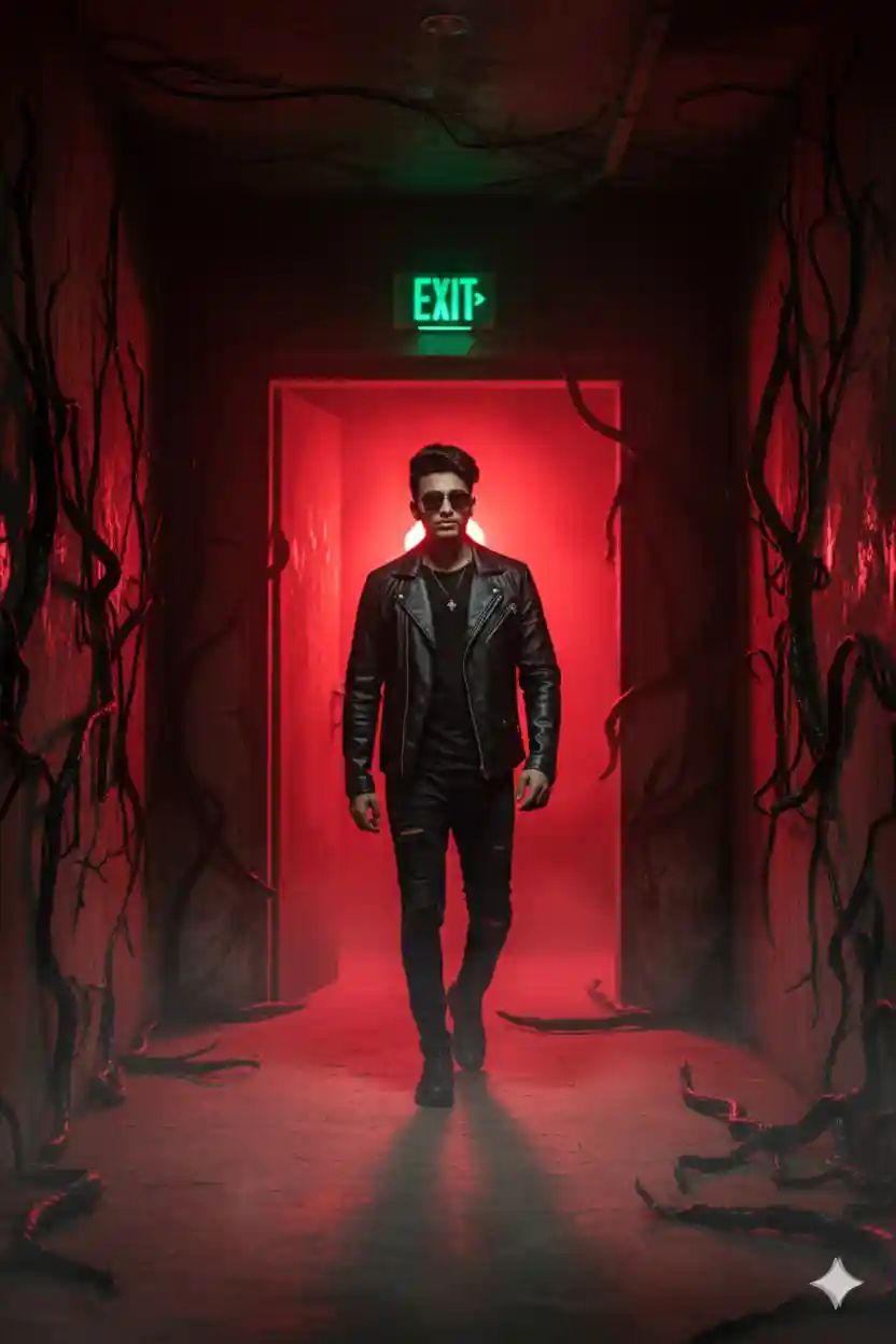 “Create a dramatic, ultra-realistic cinematic scene. Use the exact face and physical features from the reference image with 100% accuracy. Show the person wearing all-black clothing and sunglasses, walking confidently through a glowing red doorway in a dark hallway. The doorway emits intense neon-red light that casts deep, high-contrast shadows across the environment.