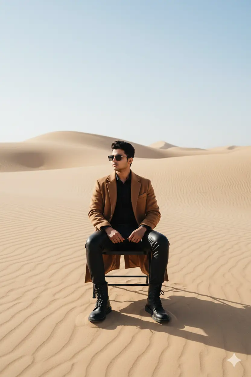"Please generate a image using my picture A striking editorial portrait of a handsome young man in a long, camel-brown overcoat and black leather pants/boots, seated on a black folding chair in the middle of a vast, bright desert with large sand dunes. Harsh, natural light. Fashion photography, high quality, cinematic."