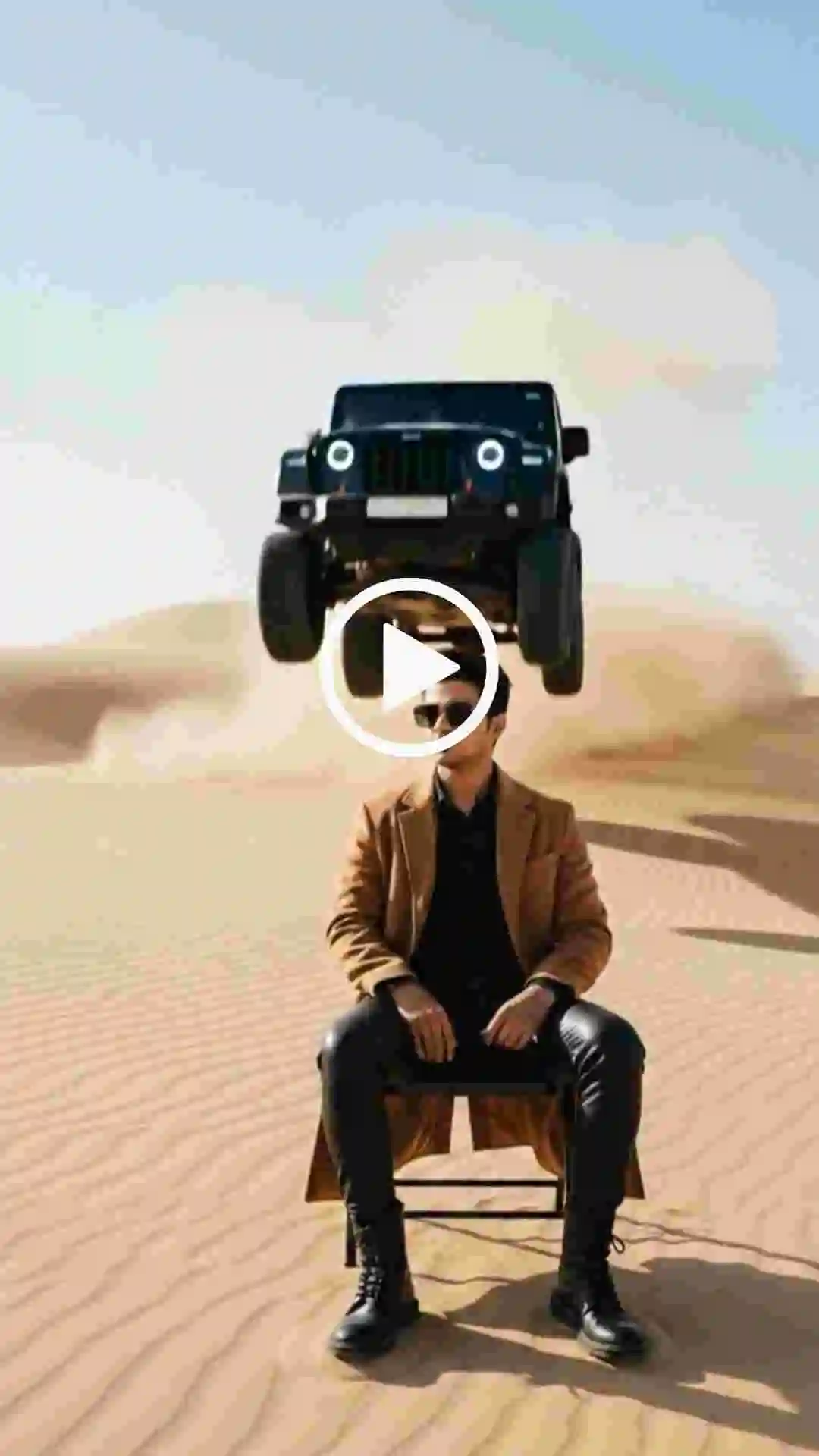 Use the uploaded image as the reference frame. Create a highly realistic cinematic desert scene. At the start of the video, the man is sitting on a folding chair with his right hand raised. As soon as the car begins to appear from behind the sand ridge, the man slowly and naturally lowers his raised hand and rests it calmly on his lap. The hand movement is smooth, subtle, and realistic, no sudden or robotic motion. The man remains confident and relaxed. Behind him is a wide sandy desert ridge. From behind the ridge, a full-size, realistically scaled black Mahindra Thar jumps into the air. The Thar looks heavy, powerful, and properly proportioned, not small or toy-like. As the Thar flies, massive desert sand and dust explode upward with realistic particle physics and depth. The Thar lands solidly on the sand and stops dramatically a short distance behind the man. Dust clouds continue to rise and slowly settle, creating a cinematic slow-motion effect. Natural desert lighting, co